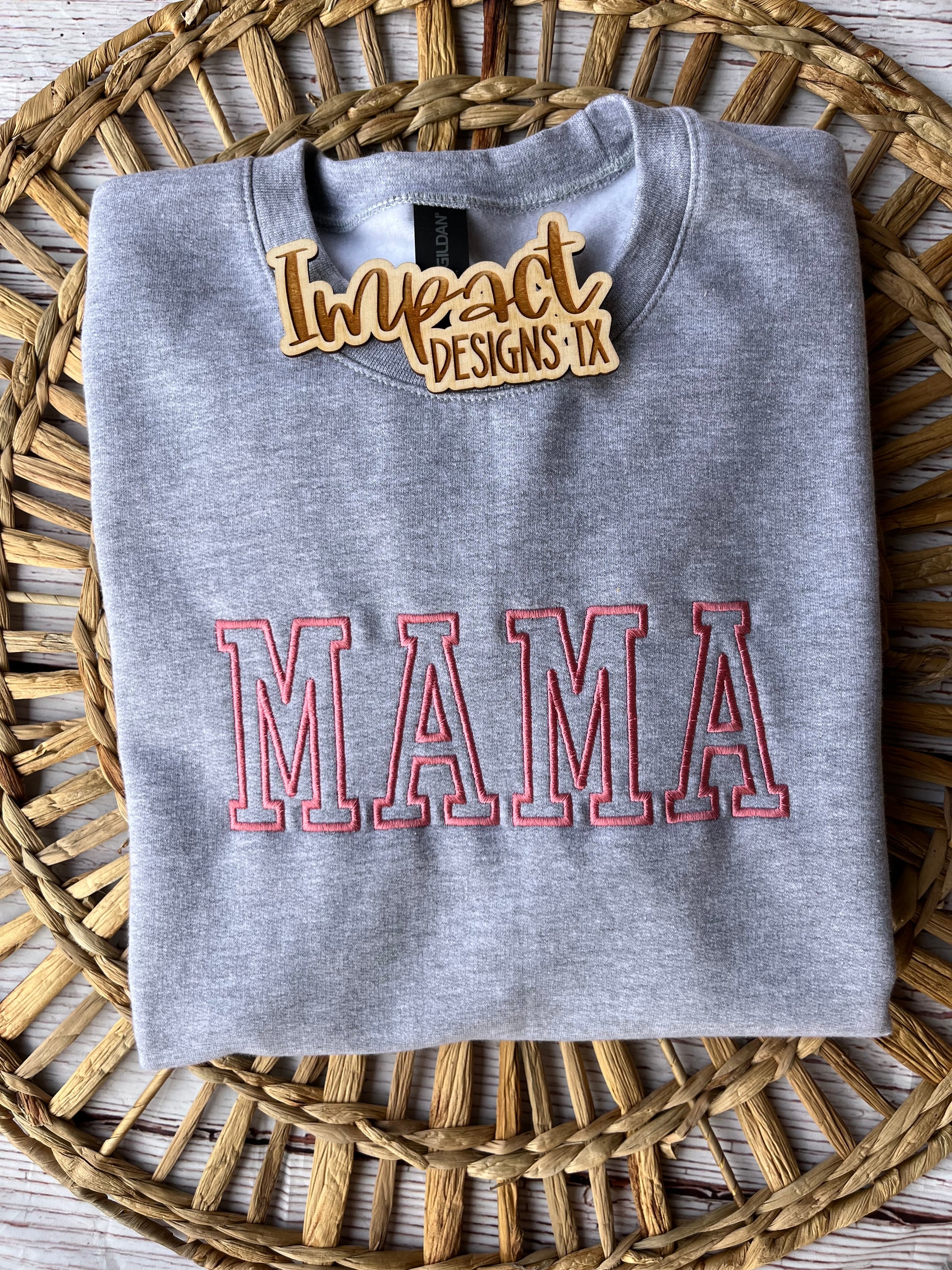 Pink “MAMA” on grey gildan sweatshirt. You are purchasing the exact item pictured! Feel free to email me at impactdesignstx.com if you would like to order this item in a different size, color or text combination!