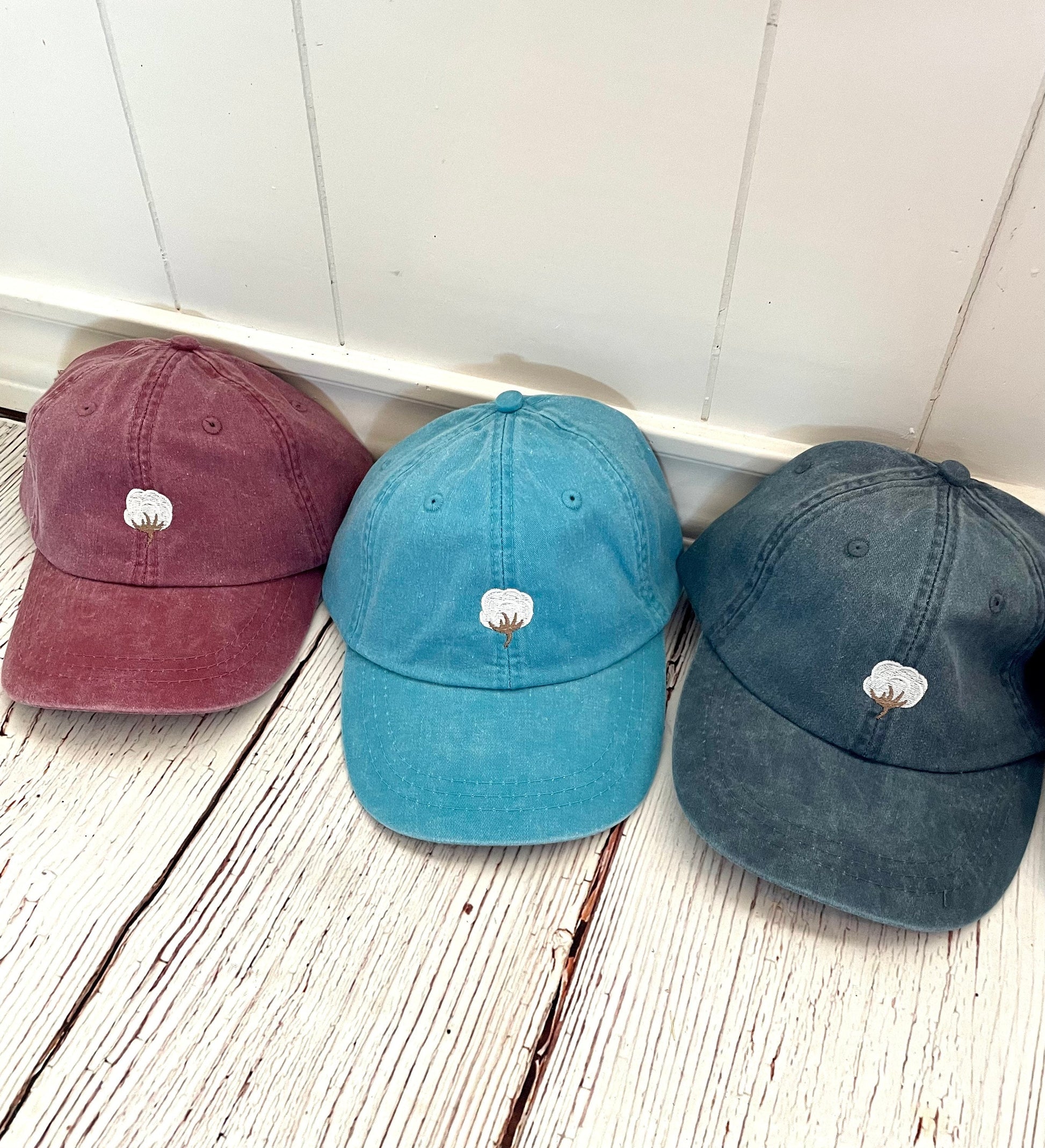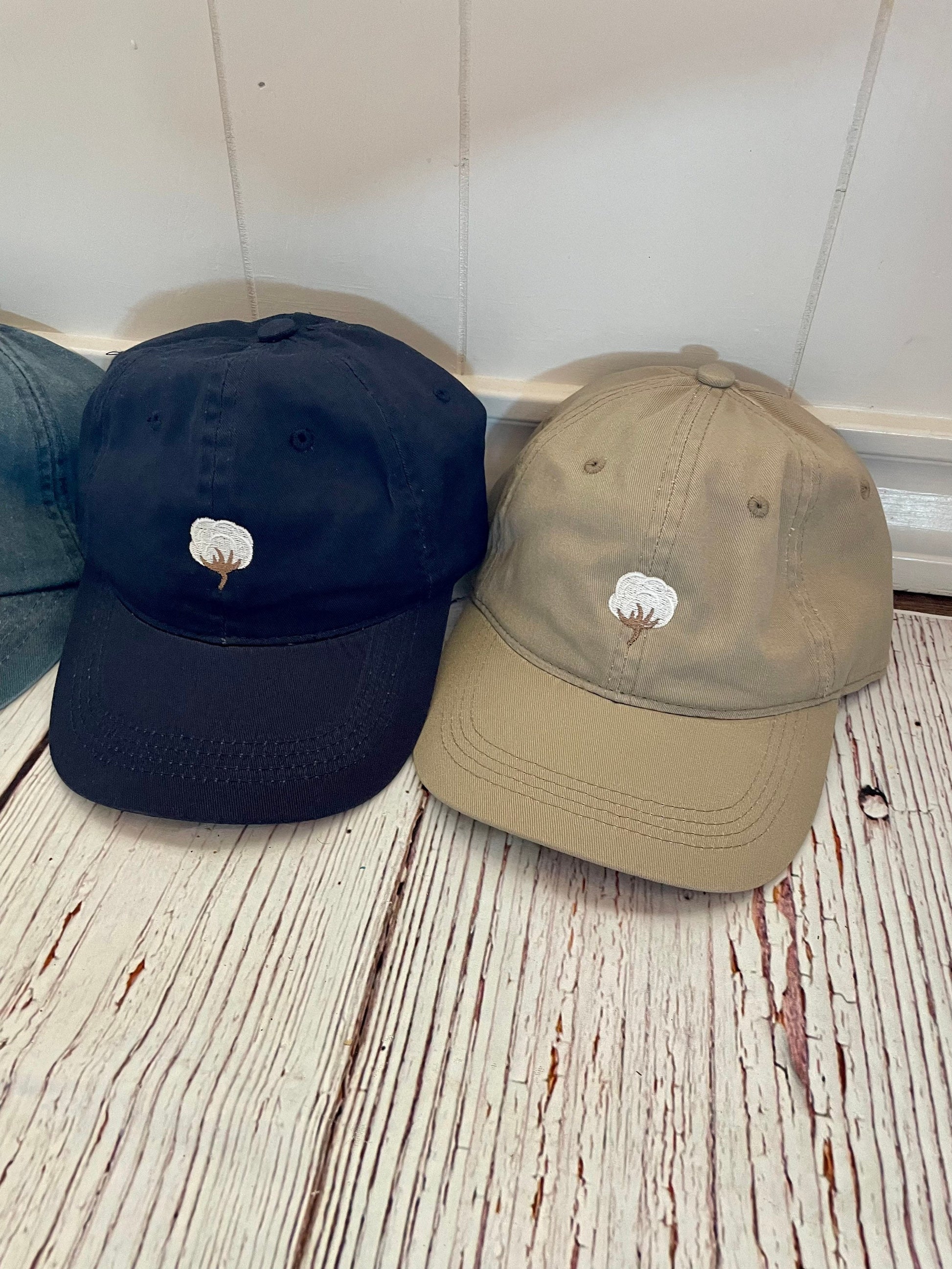 Embroidered caps with cotton bill design. The 3 on the left are Adams headwear brand with adjustable leather back and the navy and khaki are Outdoor Cap brand.