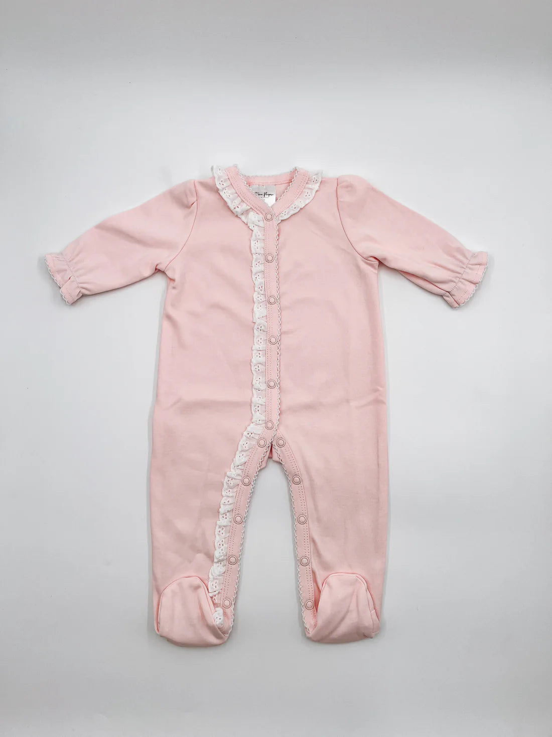 So excited to introduce our new eyelet trim footies! Cuddle those sweet babies in our softest organic cotton material! Eyelet detail added with our picot trim makes the PERFECT little outfit! 100% Organic cotton. Embroidered with name or monogram of your choice!