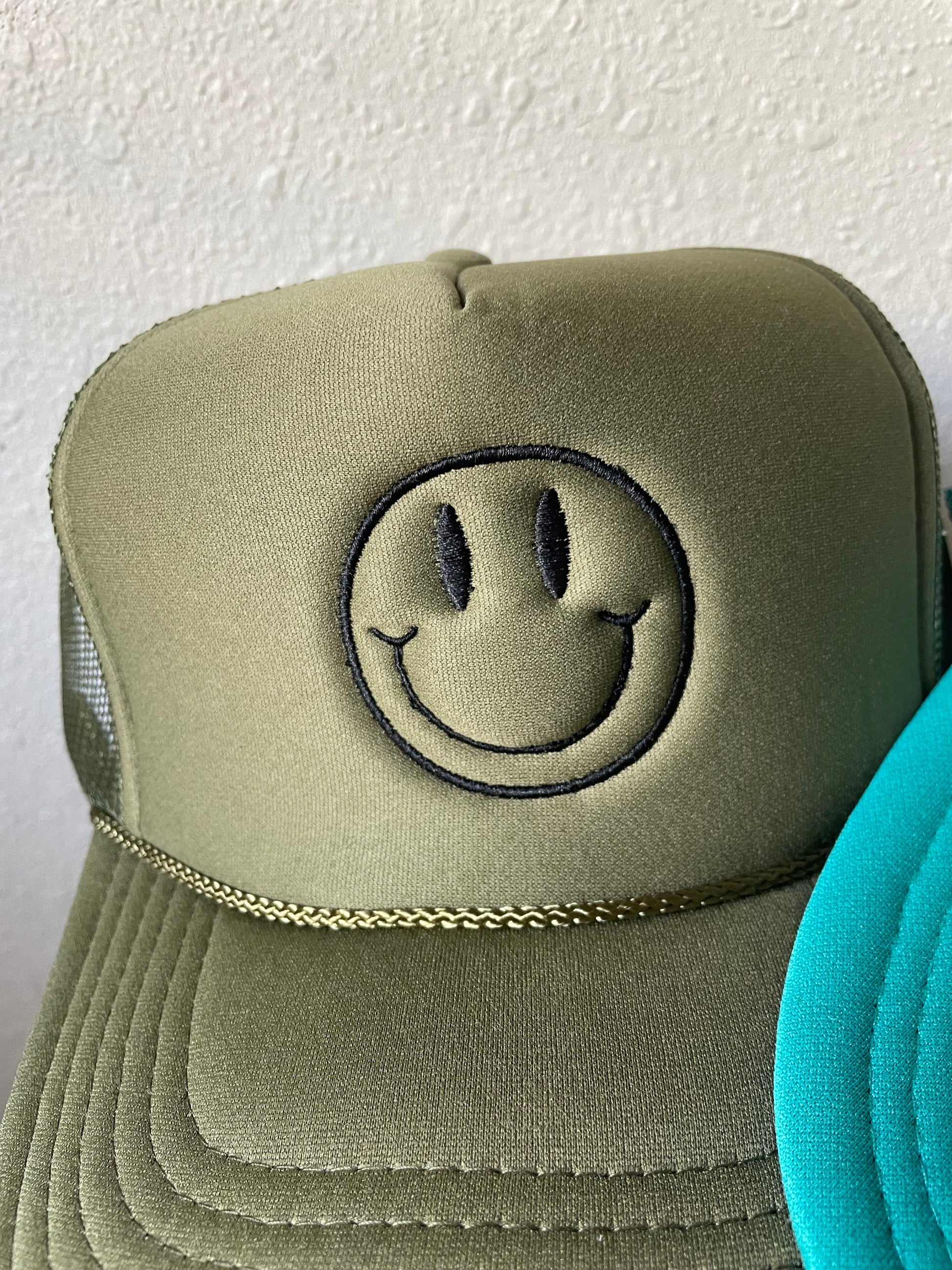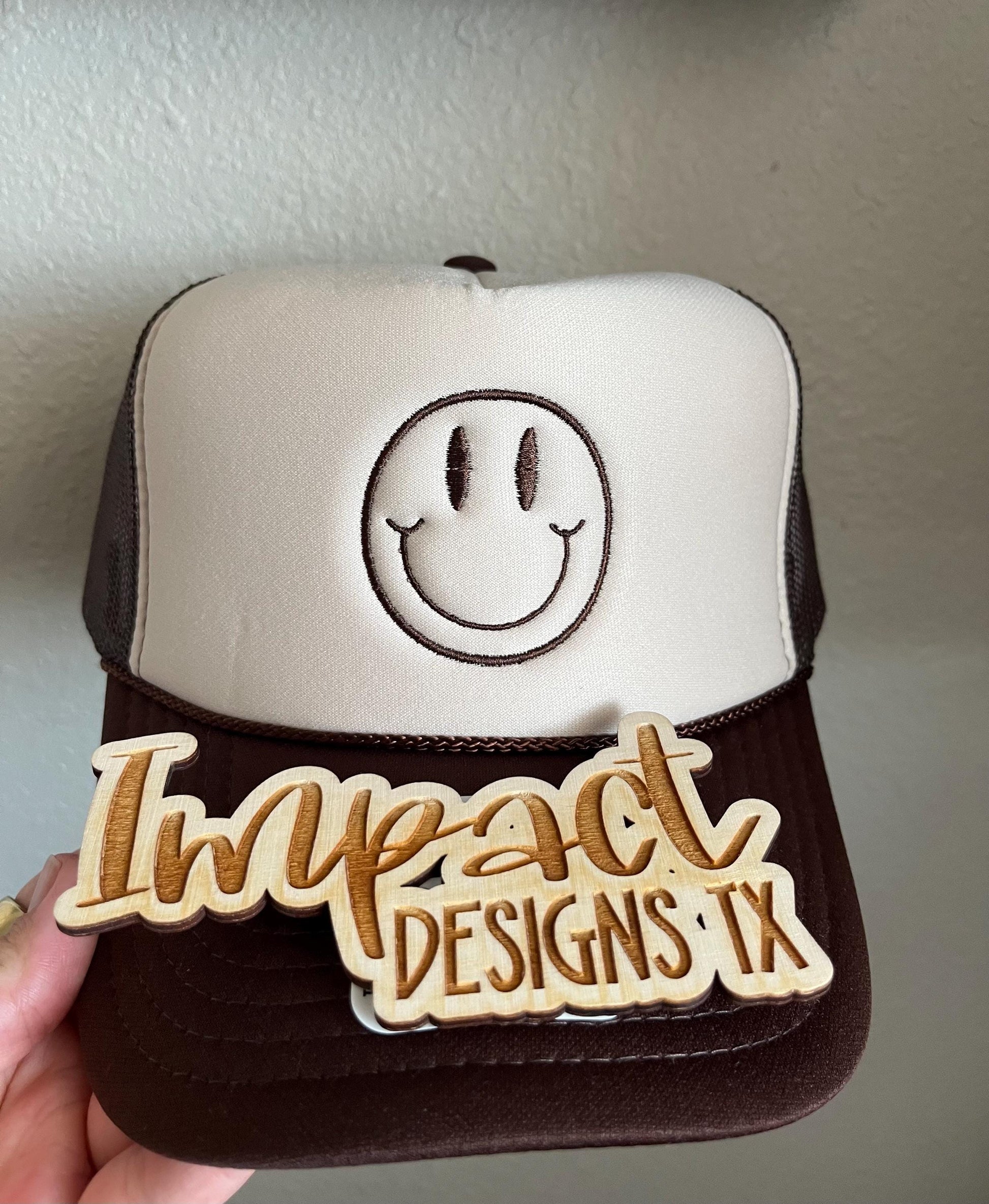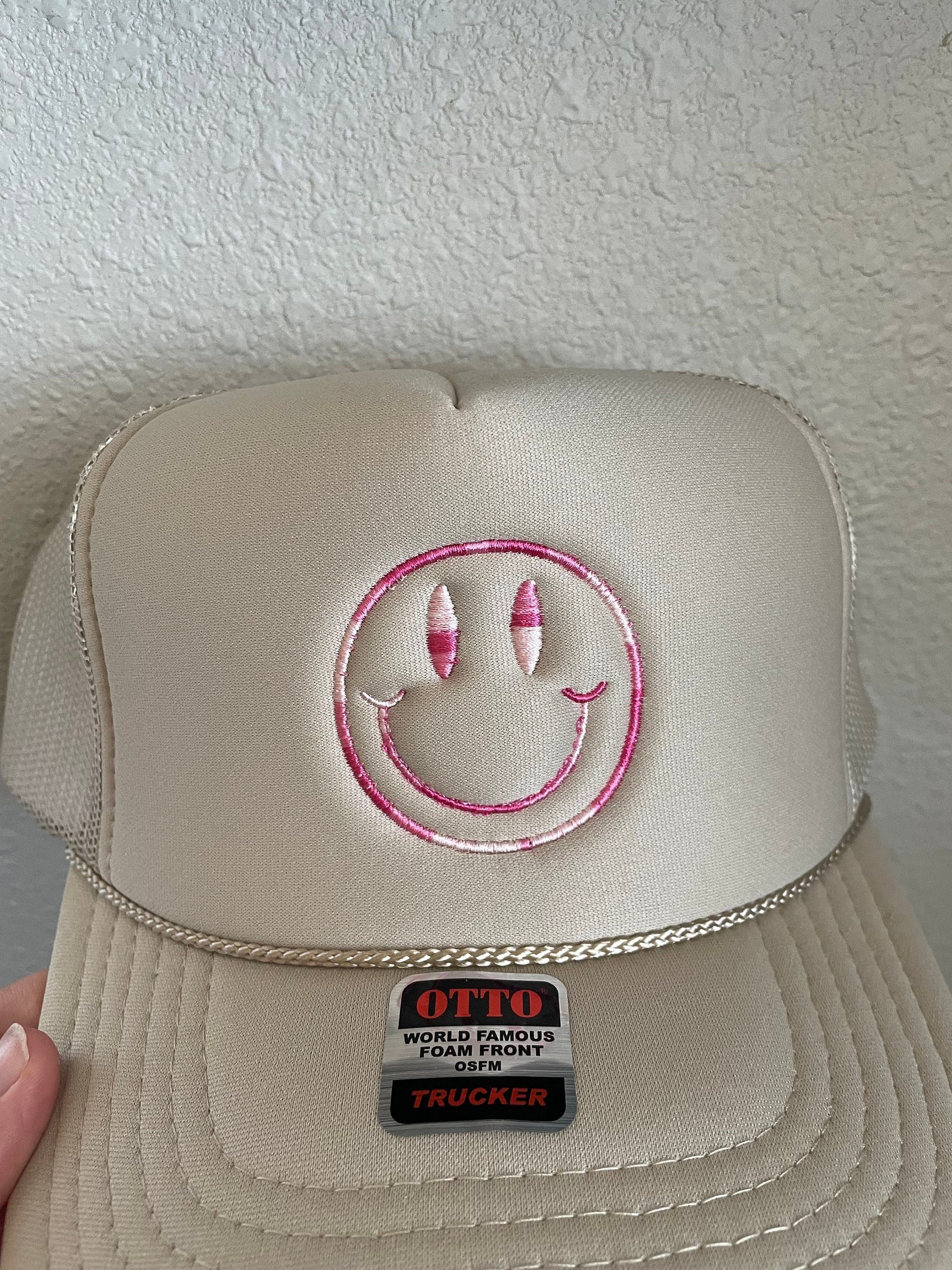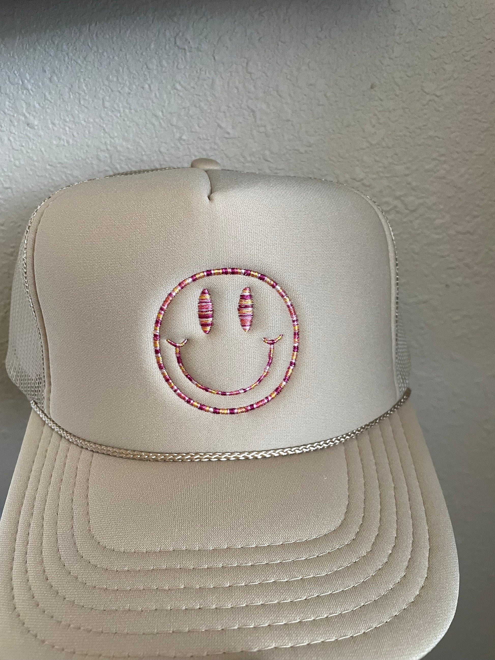 PLEASE READ Otto brand trucker hats embroidered with simple smiley face just as pictured or SUN smiley (beige only). One size fits most and hats have an adjustable snap back.