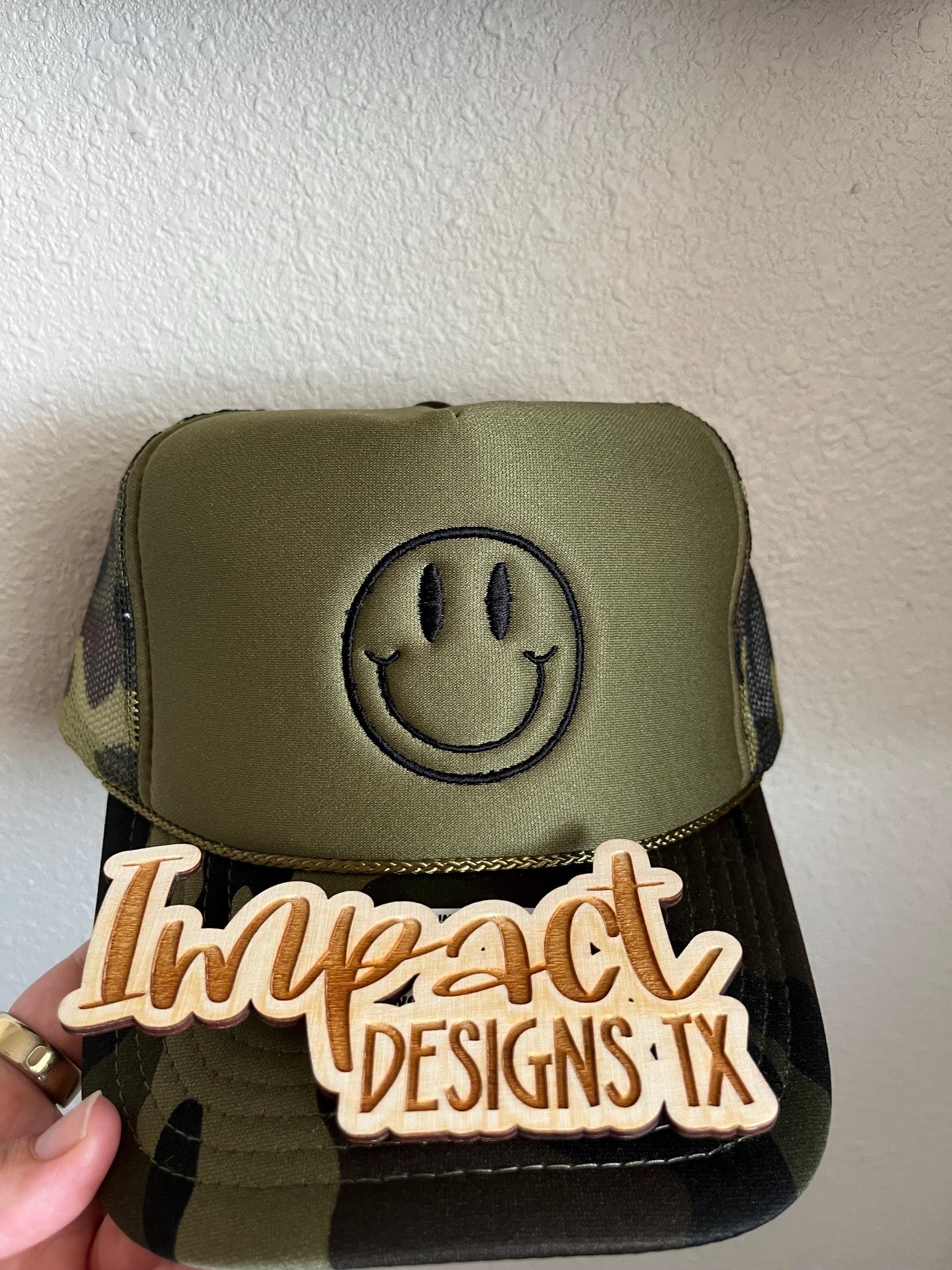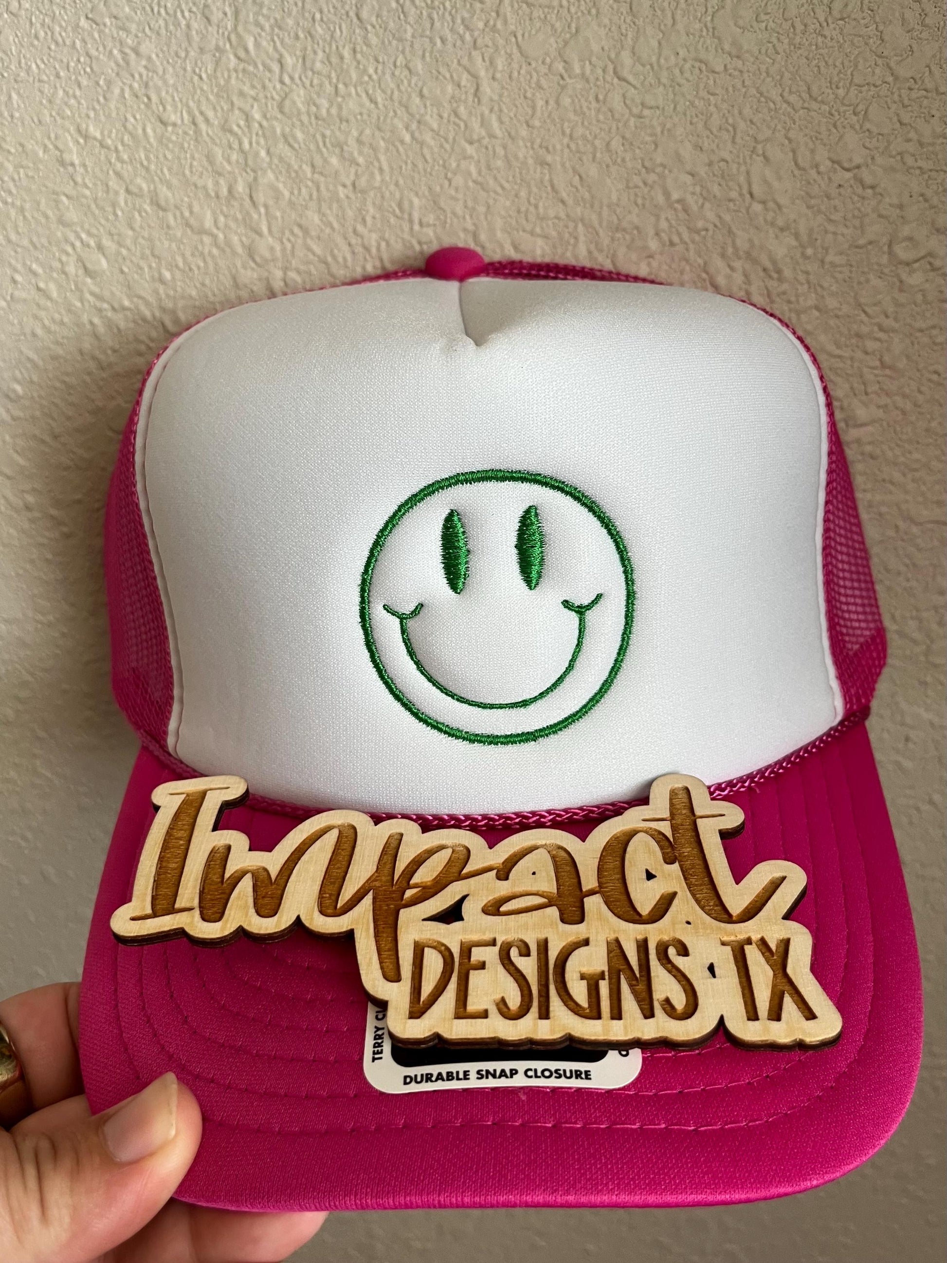 Hat will be made exactly as pictured on the listing. If you would prefer a different color smiley than what is shown, please message me. Smiley face can also be oriented upside down, just add that to the personalization.