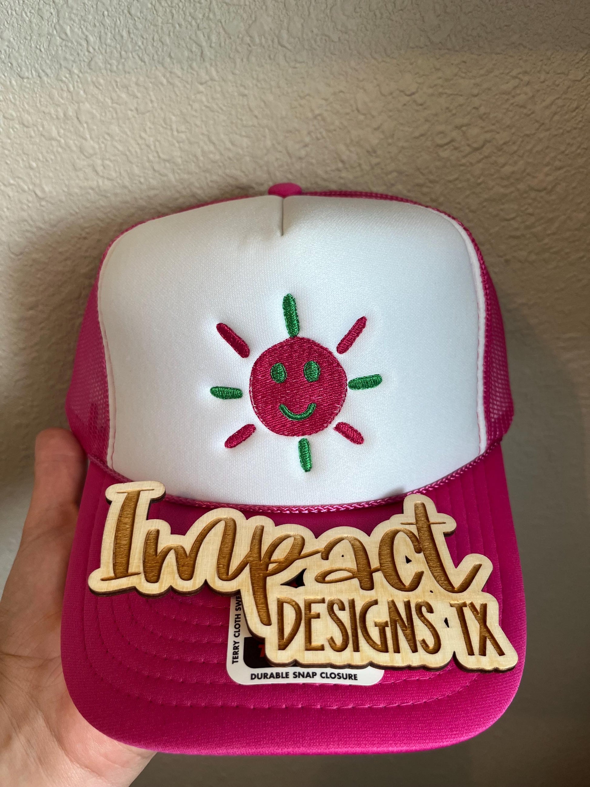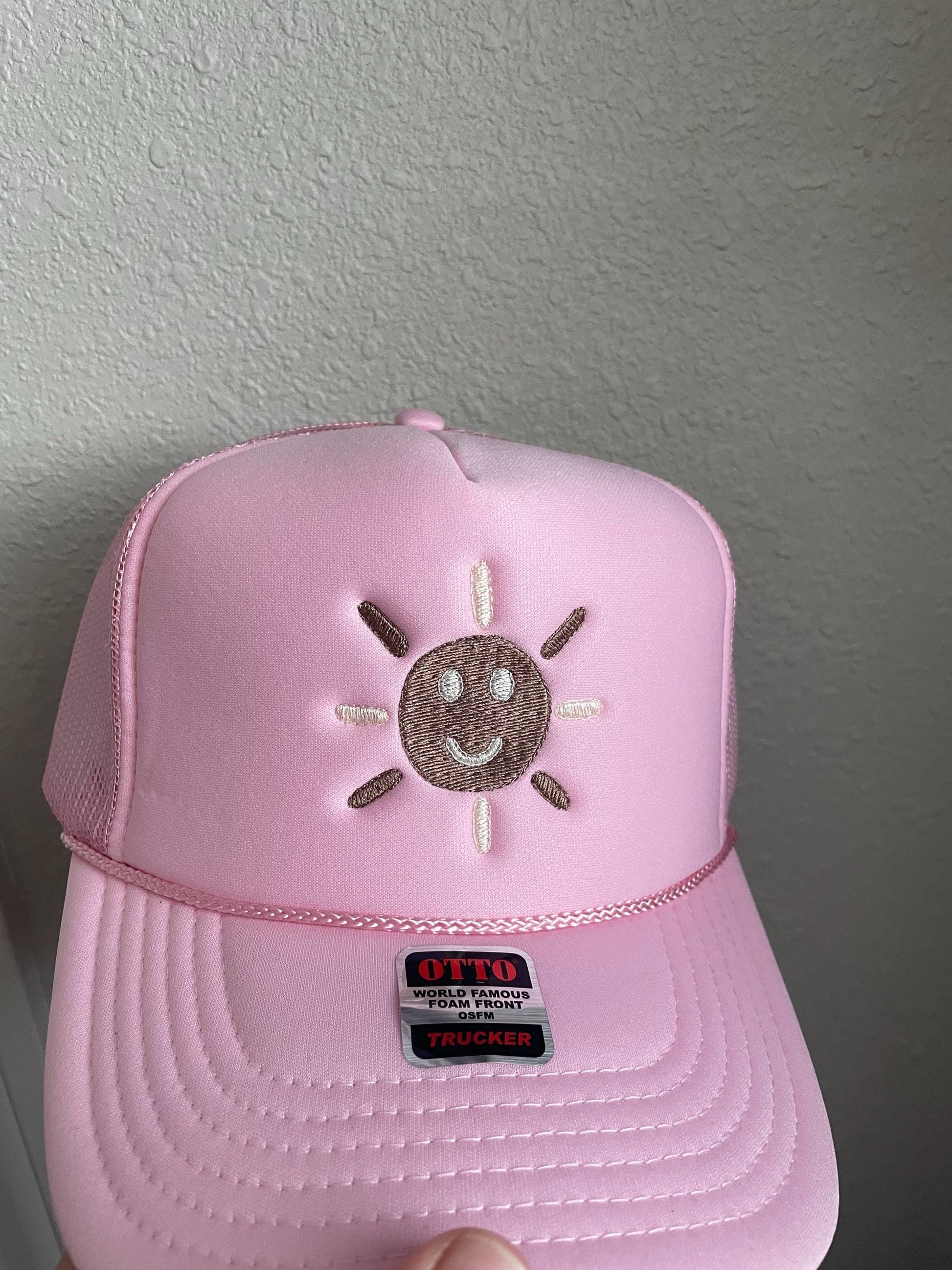 Otto brand trucker hats (39-165) embroidered with SUN smiley. One size fits most and hats have an adjustable snap back. Design has two different thread colors and can be customized. Please include desired colors in personalization.