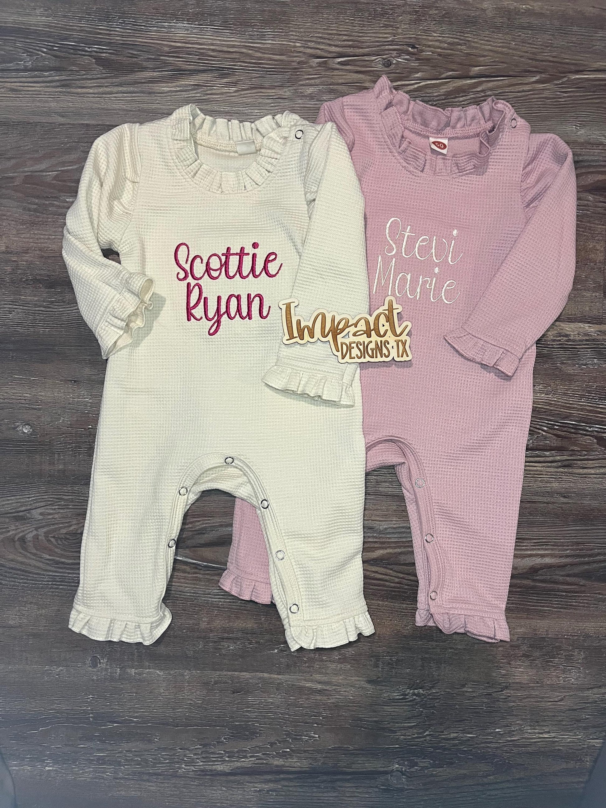 Monogrammed Baby Girl Ruffle Romper – Personalized Long Sleeve Baby Outfit